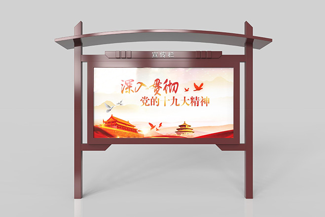 宣傳欄是一種VI應用,是組織或企業(yè)單位等進行自我宣傳的有效手段,常被應用于街道,工廠等公共場所;一般采用不銹鋼為框架,鋼化玻璃或者耐力板為面板,鋁合金為頂棚,面板可以打開更換宣傳畫面。現如今,宣傳欄廣泛應用于學校、小區(qū)、會議館、展廳等各個場地。